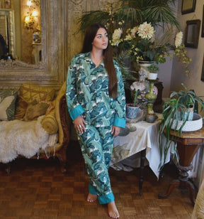 Wunderschöner Pyjama mit einem trendigen botanischen Print aus üppigem Blattwerk – überlappende Blätter in Grüntönen werden durch türkisfarbene Akzente hervorgehoben und vor einem weißen Hintergrund abgesetzt. Dieser Pyjama ist aus etwas dickerer Baumwolle als die anderen Jaipur-Pyjamas der Serie gefertigt – ideal für kältere Nächte.