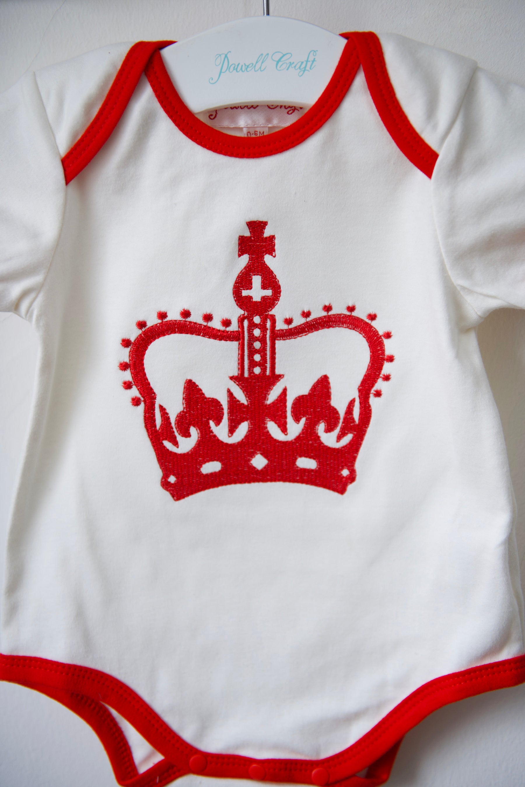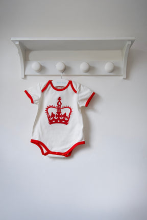 This gorgeous baby vest is perfect for your little prince or princess! The soft white cotton baby grow has an envelope neckline to make it easy to pop over baby’s head and poppers between the legs for speedy nappy changes. The neck, cuffs, and hems are edged with a jolly red trim. A large embroidered crown on the front is the final flourish!