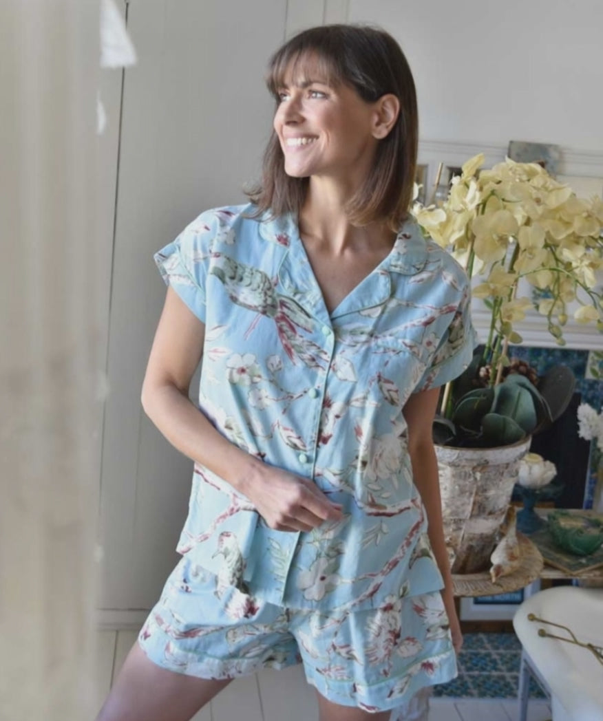 Este pijama corto de algodón con nuestros coloridos y exóticos estampados es ideal para las noches más cálidas. Nuestro patrón de flores azules es uno de los favoritos de los clientes y presenta pájaros con penachos verdes suaves sentados en ramas que se convierten en flores color crema sobre un fondo azul pálido. La chaqueta de manga corta tiene un solo bolsillo en el pecho y se abrocha con botones forrados en tela, y los pantalones cortos tienen una cintura con cordón elástico para mayor comodidad. El ribete en contraste es el toque final. Ligero y perfecto para empacar: estos pijamas seguramente se convertirán en esenciales para el verano.