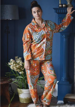 Estos pijamas con un vibrante estampado de cachemira en espiral harán que la hora de dormir sea genial. Sobre un rico fondo naranja, los motivos de cachemira agregan toques de color en turquesa, verde, amarillo y blanco. La chaqueta de pijama se abrocha con botones forrados en tela y tiene un solo bolsillo en el pecho, y los pantalones tienen un cordón en la cintura para mayor comodidad.