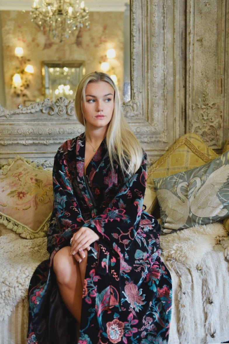 Velvet Black Exotic Flower Dressing Gown With Satin Lining