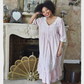 The ‘Christina’ is a soft pink button-through nightdress that falls to mid-calf and has three-quarter length lace-trimmed sleeves. This beautiful v-neckline nightgown has an abundance of pretty features; pin tucking on the bust and around the deep flounced hem, delicate flowers embroidered in white on the shoulders and the skirt and a lace trim above the bustline. This style is generously sized for a comfortable night’s sleep.