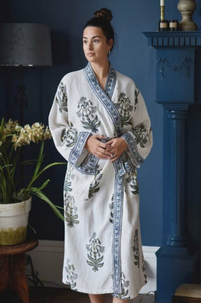 Il nostro lussuoso accappatoio in cotone con trama waffle porta un'atmosfera da spa in bagno! La vestaglia è stampata con un motivo botanico su larga scala e bordata con un bordo blu e grigio sui polsini, sulla tasca e sul davanti aperto e ha una cintura abbinata.