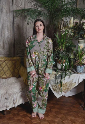 Questa stampa su larga scala presenta gigli stargazer bianchi arrossati di rosa caldo, rami con spruzzi di fiori bianchi e fogliame verde frondoso su uno sfondo grigio medio. I colori della stampa sono completati dal bordo a contrasto verde felce con bordo pom-pom sui polsini della giacca e sugli orli dei pantaloni. La giacca del pigiama si chiude con bottoni rivestiti in tessuto e ha un taschino singolo sul petto, mentre i pantaloni hanno una vita elasticizzata con coulisse per il massimo comfort.