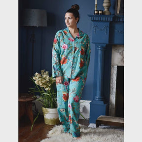 この鮮やかなパジャマでスタイルを主張しましょう。鮮やかな青緑の背景に色とりどりのエキゾチックな花や葉を描いたこの美しいプリントは、就寝時間をカラフルに彩ります。 ジャケットの袖口とパンツの裾に施された、対照的なセージグリーンのポンポントリムがプリントを引き立てています。パジャマ ジャケットは生地で覆われたボタンで留められ、胸ポケットが 1 つ付いています。パンツのウエストは伸縮性のあるドローストリングで快適です。