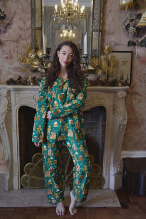 Everyone loves new nightwear at Christmas time and there’s lots of festive fun with this gingerbread-themed print. A really joyous print of gingerbread men and gingerbread houses, Christmas puddings, biscuits and candy canes on a Christmassy green background. The pyjama jacket fastens with fabric-covered buttons and has a single breast pocket, and the trousers have a drawstring waist for comfort. The print is complimented with a jolly red trim around the collar, cuffs, and across the pocket.