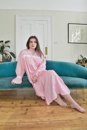 A pink version of our beautiful classic looking Anna nightdress. The long-sleeved, full-length nightgown features an open ruffled collar and a covered buttoned placket making it look straight from the Regency era! Rows of pin tucks run from the shoulders down to the bustline with lace embellishment across and more lace above the wrist giving a lovely gathered shape to the cuffs. 100% lightweight cotton
