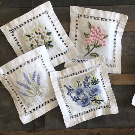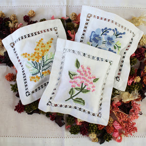 White cotton square sachets filled with your choice of dried British lavender or potpourri. These beautiful sachets have a drawn thread decorative border and are colourfully embroidered with pretty floral motifs. They are perfect for hanging in wardrobes, tucking into drawers, or placing under pillows to allow the delicate fragrance to gently scent your home.