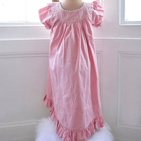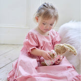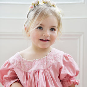 The Clementine dress is so pretty and perfect for warmer days. The soft blush pink dress has a rounded neckline that is embroidered with flowers and leaves and finished with a decorative trim. The puffed short sleeves have an elasticated frill, the skirt has rows of fine pin tucking and the hem is finished with a frill all around. This style is the perfect light and airy summer dress.