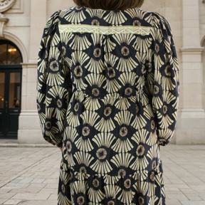 Netra, Black & Gold Fan Print Viscose Long Sleeve Dress
