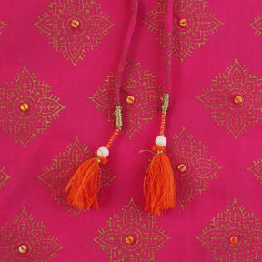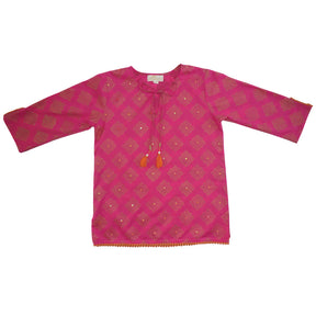 Our beautiful hot pink cotton kaftan is perfect as a beach cover up but looks stylish worn as a top with shorts or jeans. The kaftan is block printed all over with a gold geometric design and it has ties with beaded orange tassels at the open neck, and pom-pom trim around the cuffs and on the side splits for those bohemian summer vibes.