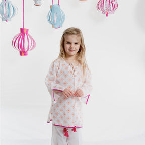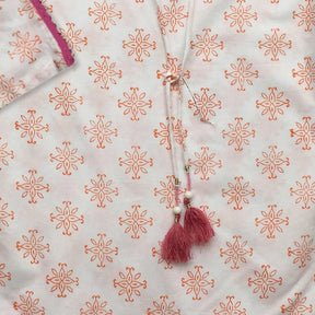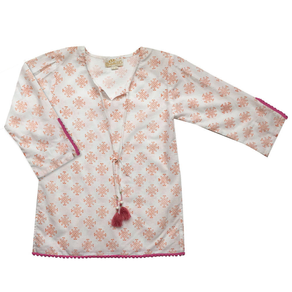 Our beautiful white cotton kaftan is perfect as a beach cover-up but looks stylish worn as a top with shorts or jeans. The kaftan is block printed all over with an orange geometric design and it has ties with hot pink tassels at the open neck, and pom-pom trim around the cuffs and on the side splits of the sleeves for those bohemian summer vibes.