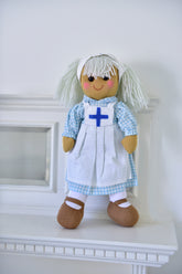 Our nurse doll is ready for duty in her smart uniform and is one of our best-sellers. She wears a blue gingham dress under a white apron with an appliqued blue cross, a nurse’s cap over her blonde hair and brown strapped shoes.
