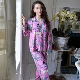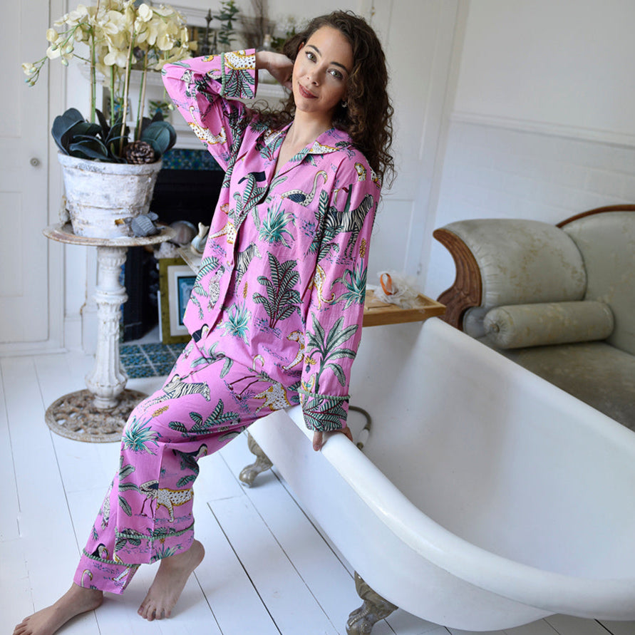 Make bedtime wild with our safari-themed pyjamas! Leopards, zebras, monkeys, and African birds roam the savanna against a backdrop of lush foliage and stylised trees. The print pops with greens, brown, maroon, and highlights of mustard on a pink background. The stylish pyjamas are finished off with a complimentary green pom pom trim.